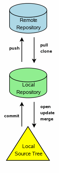 When multiple developers are working on the same project, each developer typically has his or her own local repository and an associated source tree in which to work. Developers share their work by "syncing" the content of their local repositories either directly or through a central server. Changes can "push" from the local repository into a remote repository. Or changes can "pull" from a remote repository into a local repository. Or one can do a "sync" which is a shortcut for doing both a push and a pull at the same time. Fossil also has the concept of "cloning". A "clone" is like a "pull", except that instead of beginning with an existing local repository, a clone begins with nothing and creates a new local repository that is a duplicate of a remote repository.